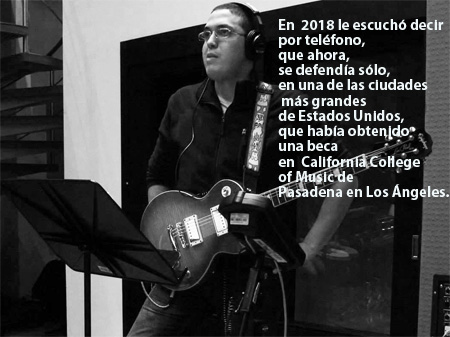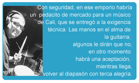 En un redondo, resolviendo entre ir a España, a aprender flamenco, o a tocar jazz, o viajar a los Estados Unidos, había dicho: "Madre, présteme dinero para comprar el tiquete". Ahora estaba parado, en la ciudad de la factoría musical y del negocio cinematográfico. Nicolás Cobo, en el botón del universo discográfico, en la civilización de festivales y de conciertos que, para su sorpresa, se realizaban en la misma fecha, y en la misma hora, todos con boletería agotada. Con seguridad, en ese emporio, habría un pedacito de mercado para un músico de Cali, que se entregó a la exigencia técnica. Las manos en el alma de la guitarra; algunos le dirán que no, en otro momento abrá una aceptación, volver al diapasón, con terca alegría, mañana le dirán que vuelva. Habría un lugar en donde rentabilizar todo lo estudiado.